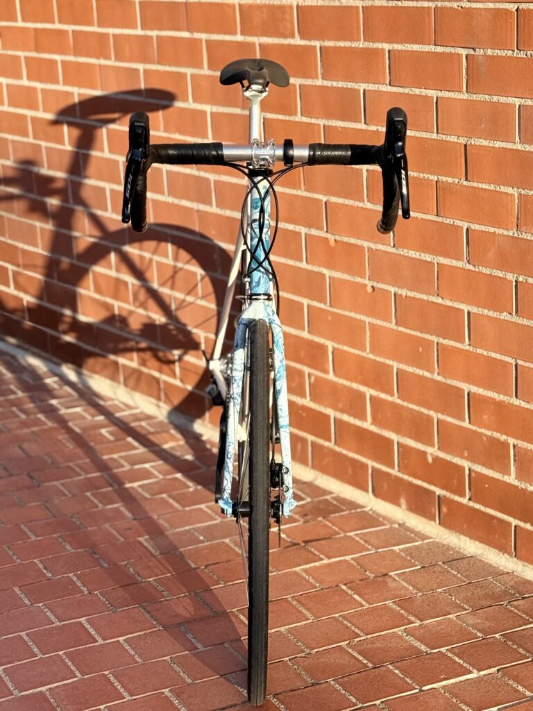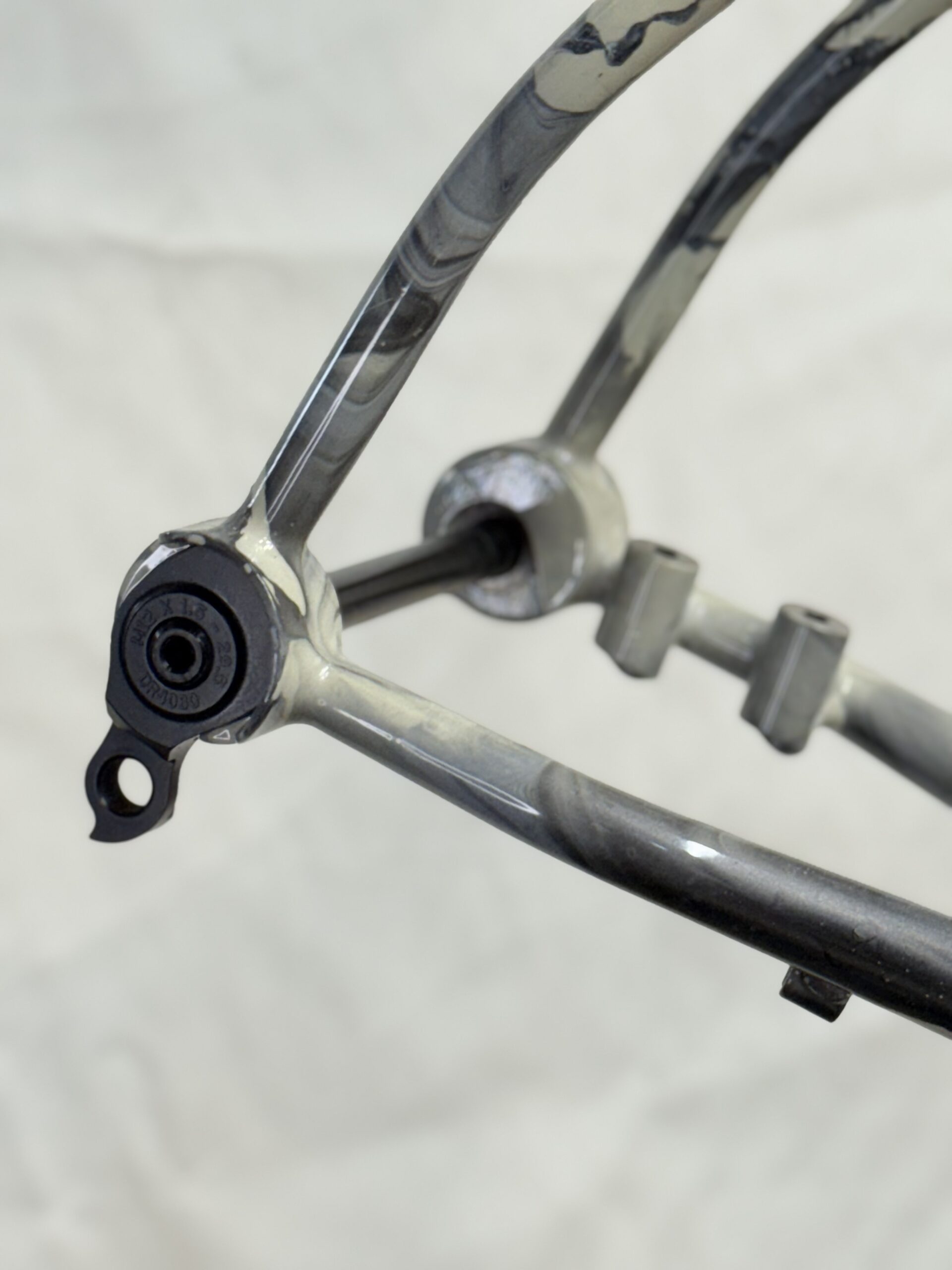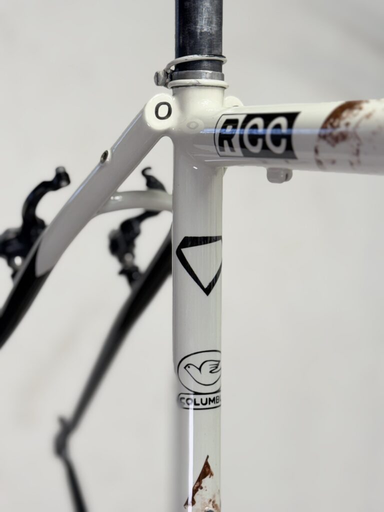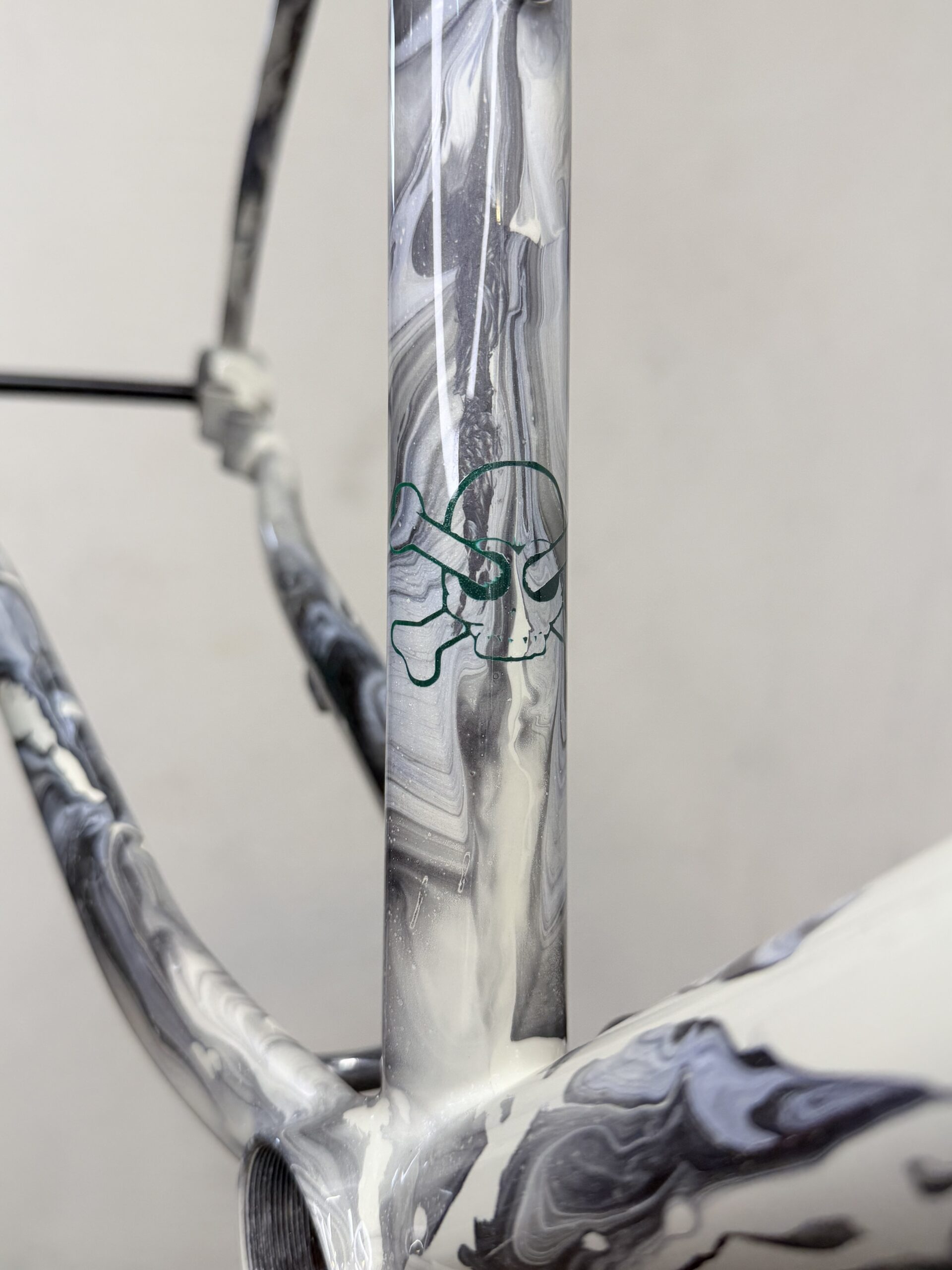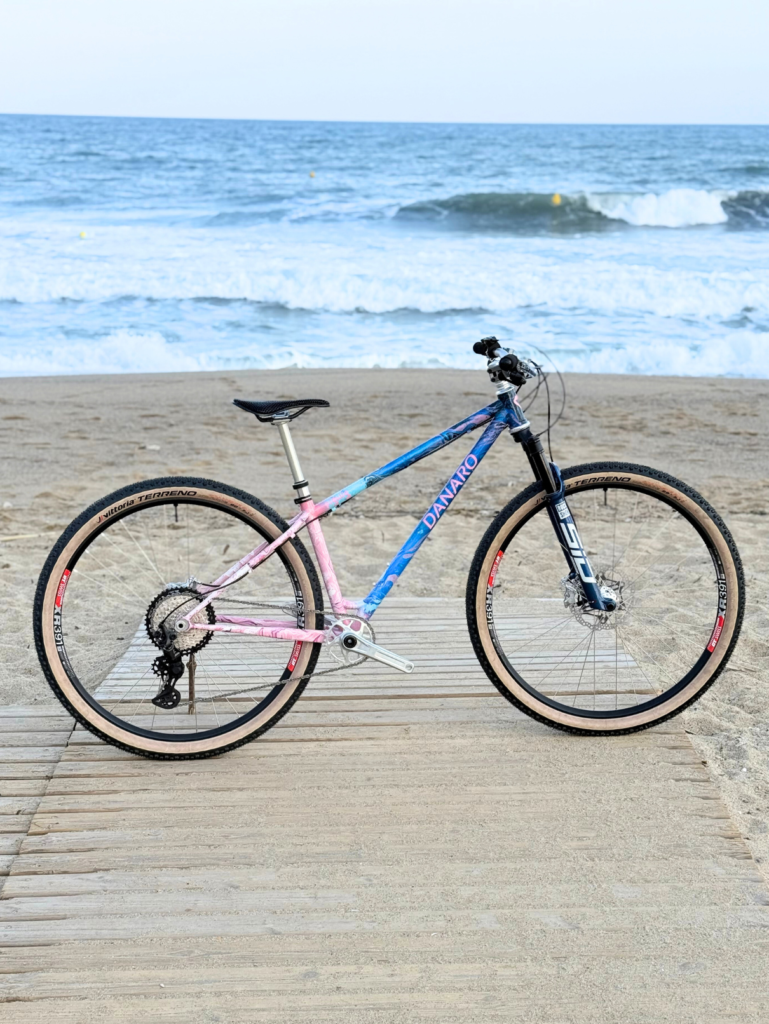 Cuadro original en acero Columbus sometido a un proceso completo de personalización. Debido a las proporciones originales del cuadro, incompatibles con la geometría del cliente, se procedió al corte y rediseño de sus ángulos para adaptar la geometría a su medida exacta. Una vez ajustada la estructura, el cuadro fue finalizado con pintura mediante el método hydro dip, obteniendo un acabado único e irrepetible.