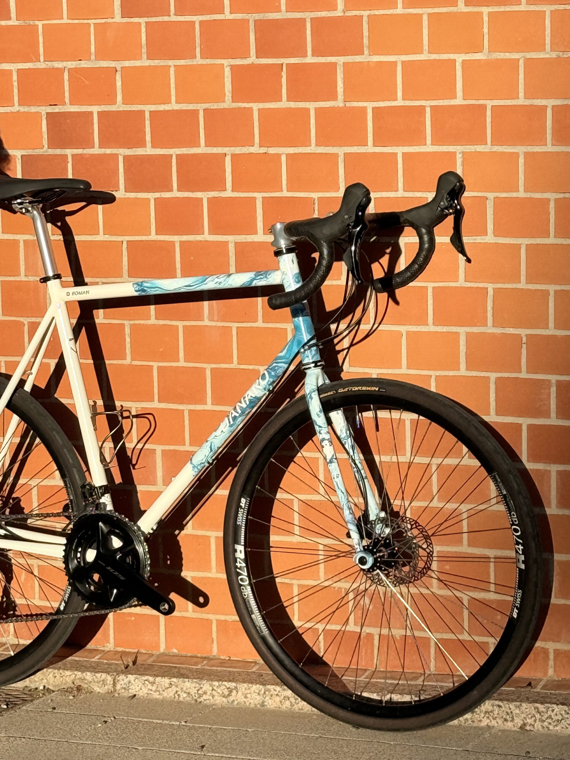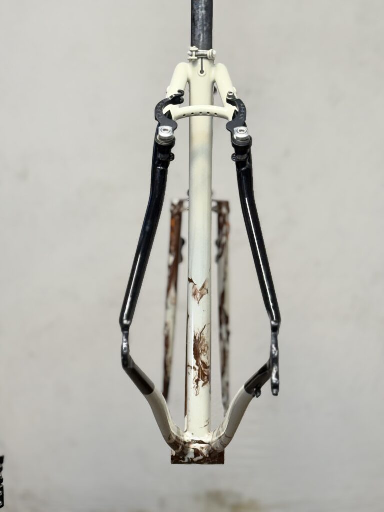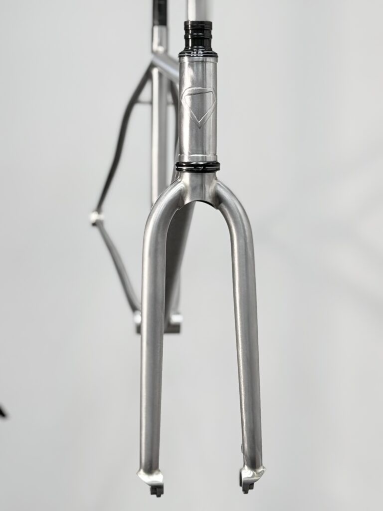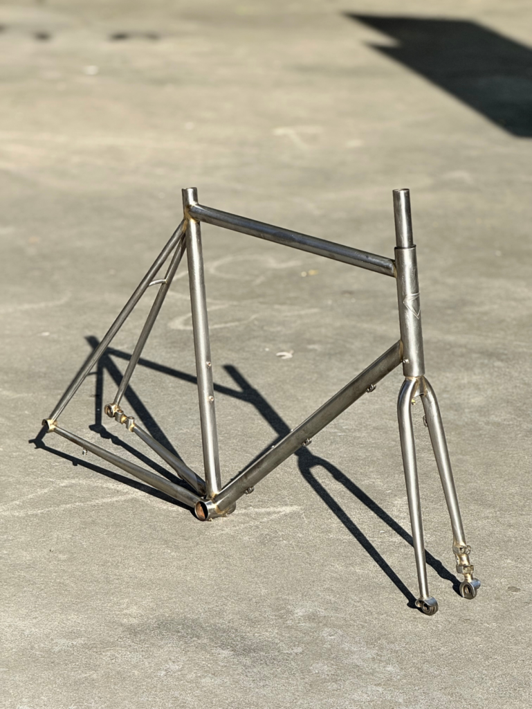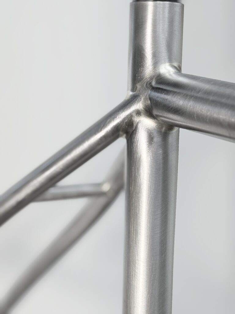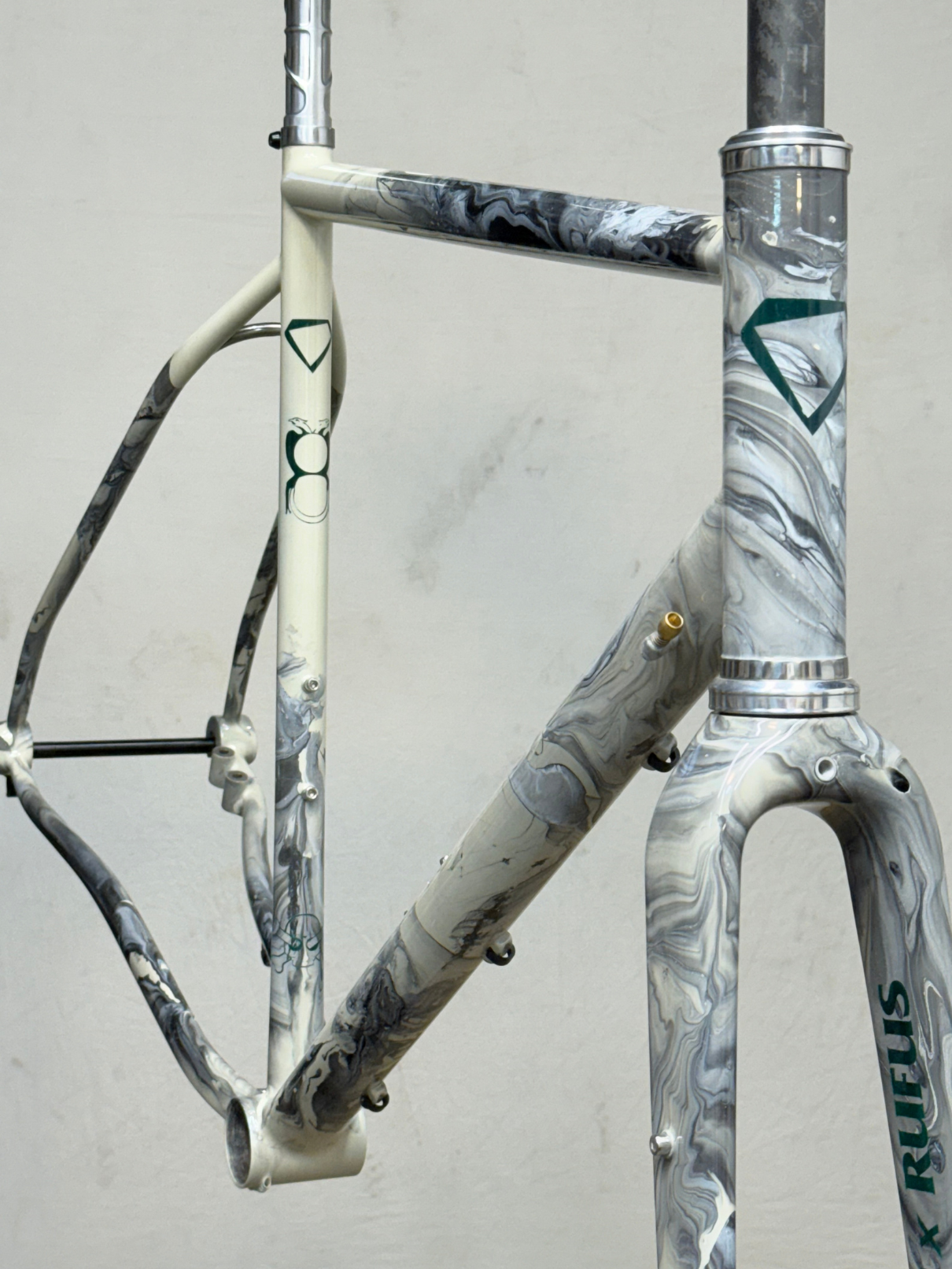 Cuadro original en acero Columbus sometido a un proceso completo de personalización. Debido a las proporciones originales del cuadro, incompatibles con la geometría del cliente, se procedió al corte y rediseño de sus ángulos para adaptar la geometría a su medida exacta. Una vez ajustada la estructura, el cuadro fue finalizado con pintura mediante el método hydro dip, obteniendo un acabado único e irrepetible.