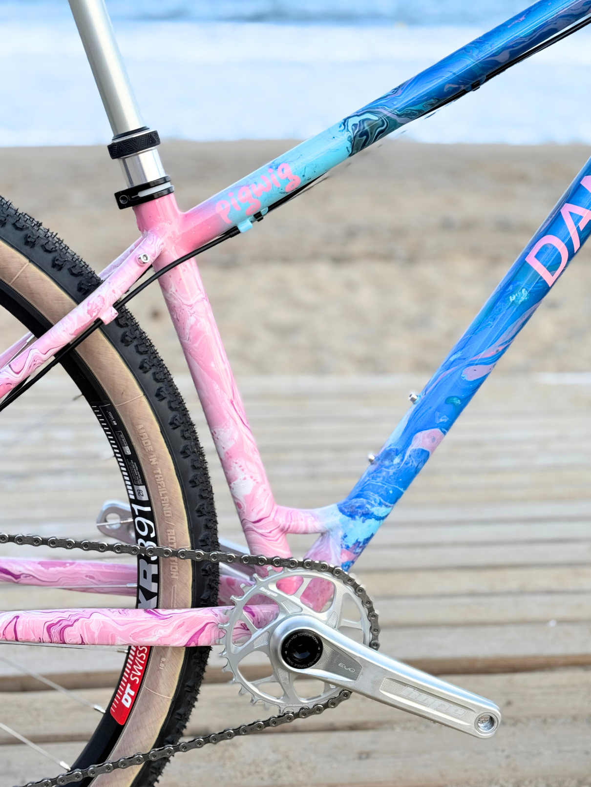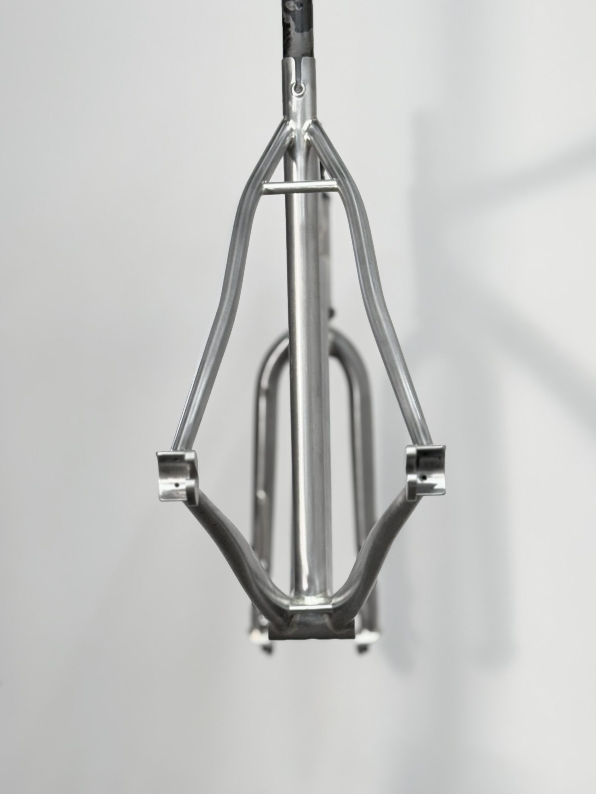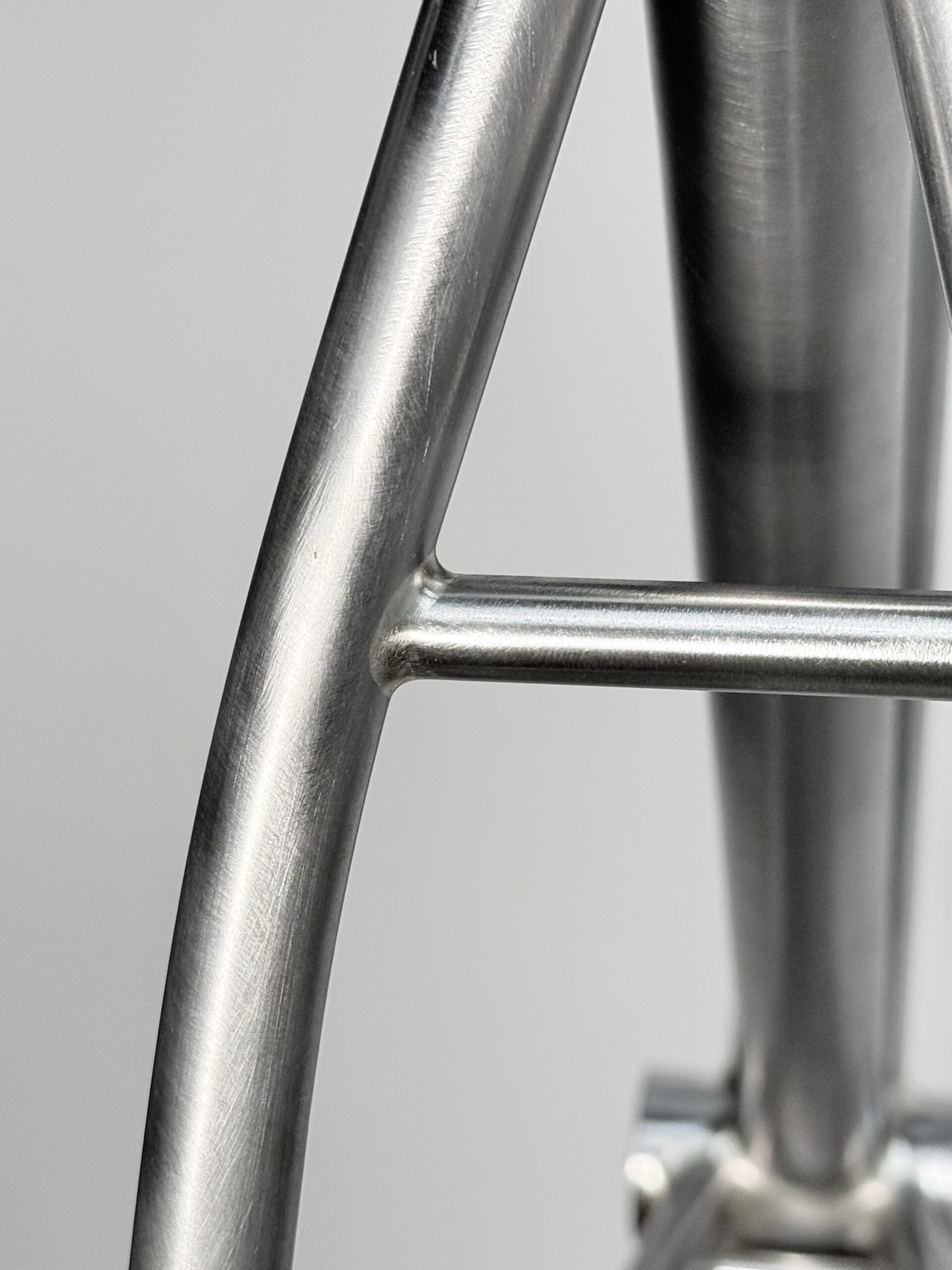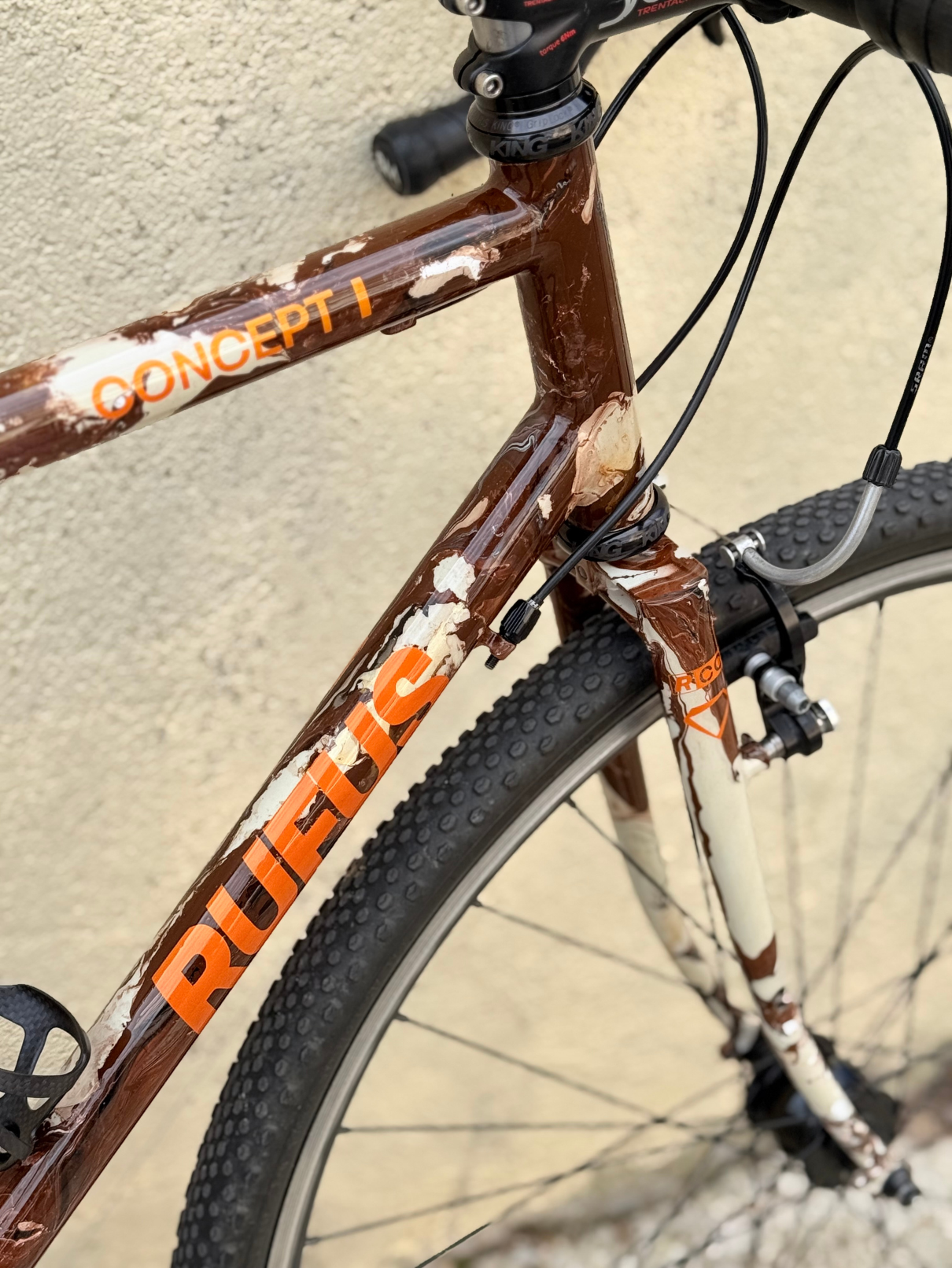 Cuadro original en acero Columbus sometido a un proceso completo de personalización. Debido a las proporciones originales del cuadro, incompatibles con la geometría del cliente, se procedió al corte y rediseño de sus ángulos para adaptar la geometría a su medida exacta. Una vez ajustada la estructura, el cuadro fue finalizado con pintura mediante el método hydro dip, obteniendo un acabado único e irrepetible.