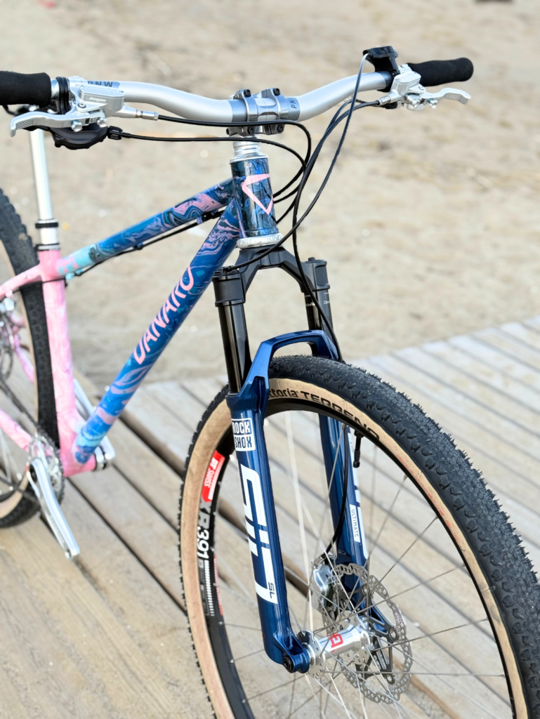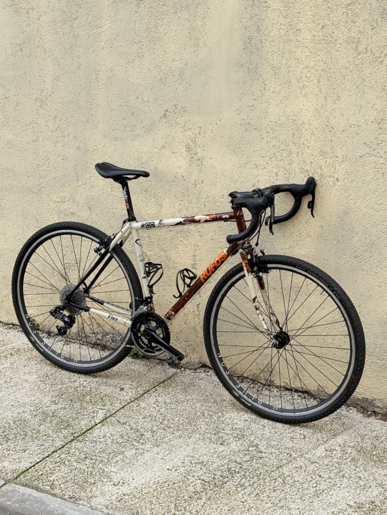 Cuadro y horquilla en acero Columbus Zona con bases de pedalier, dropouts delantero y trasero y portabidones de Paragon Machine Works (142×12 / 100×12). Ruedas hechas a mano con llantas y radios DT Swiss, cubos Novatec y neumáticos Gatorskin 700×32. Grupo de freno de disco Shimano 105 de 12 velocidades. Potencia, manillar y tija Ritchey.