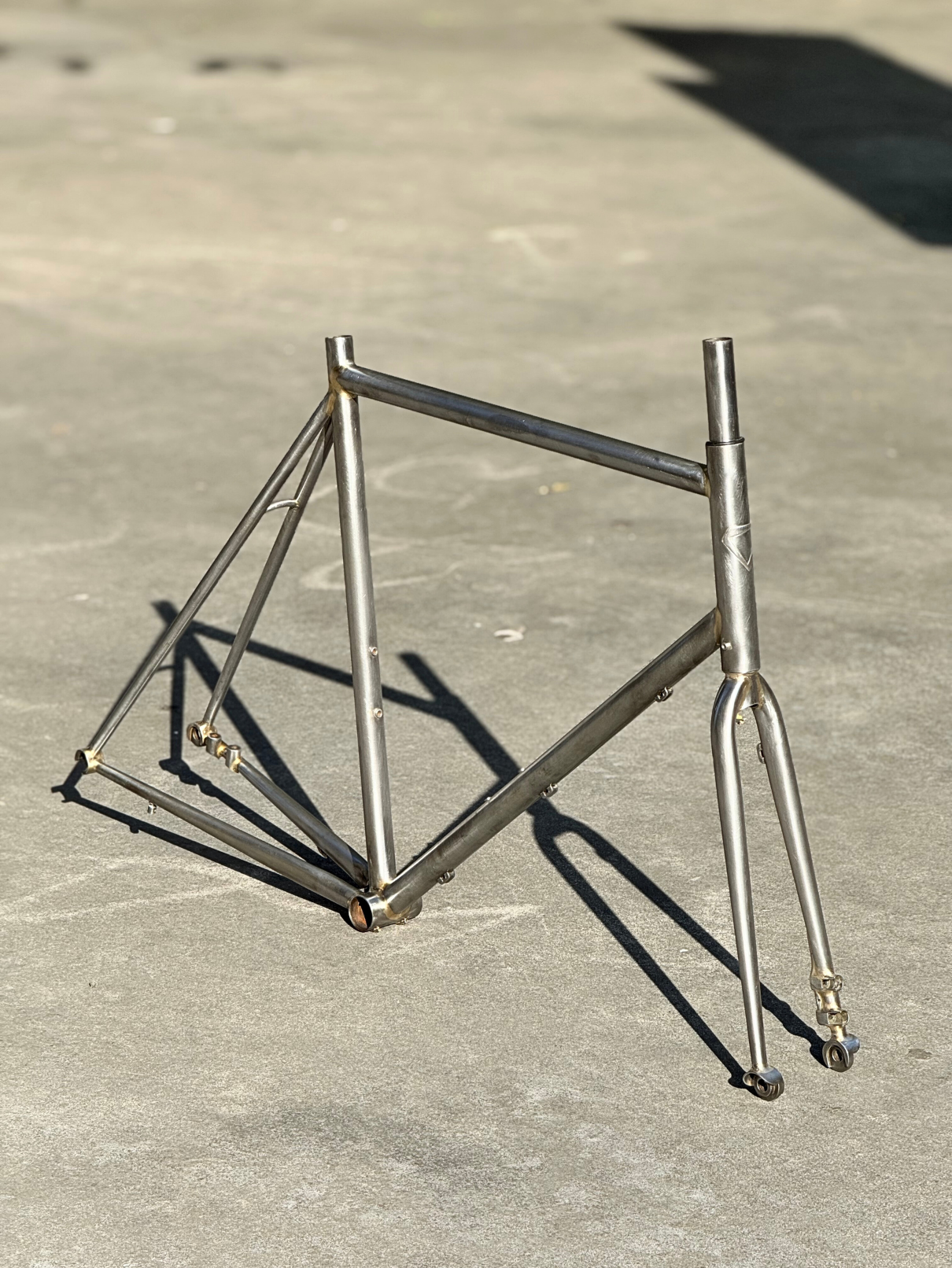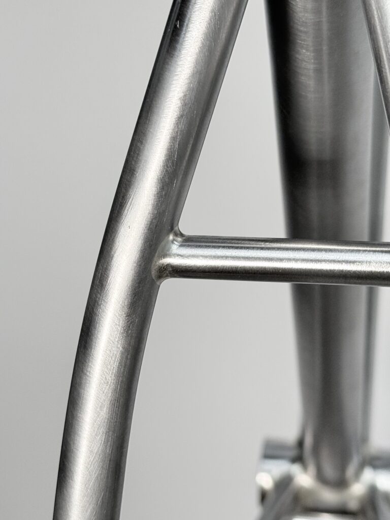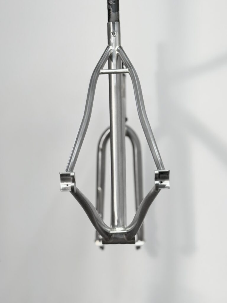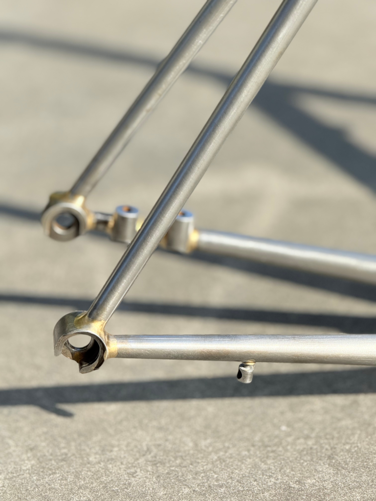 Brass fillet brazed Deda Zero class tubing, with silver brazed inox rings on the headtube, inox bridges and cable passages and stops.