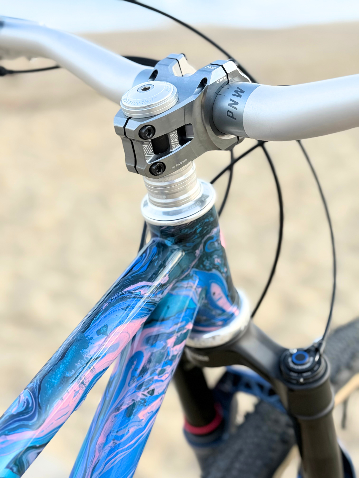 Paragon Machine Parts t47 BB, flat mount brake bosses, bottle bosses, cable guides, stops and 12×142 dropouts.